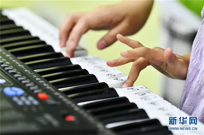 8月13日,在貴州省思南縣雙塘街道麗景社區(qū)易地扶貧搬遷安置點(diǎn),志愿者在指導(dǎo)孩子學(xué)彈電子琴。 新華社記者 楊文斌 攝
