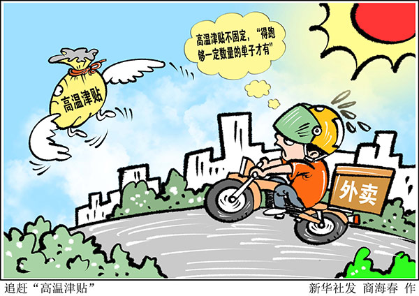 采訪中,有的勞動(dòng)者反映,往年可以拿到高溫津貼,今年要么沒動(dòng)靜,要么到手的大幅“縮水”。某平臺(tái)外賣騎手小李告訴記者,去年還有高溫津貼可拿,今年到目前什么都沒有。另一名騎手小朱說,高溫津貼不固定,“得跑夠一定數(shù)量的單子才有”。還有其他平臺(tái)的一些騎手表示沒聽說過有津貼。