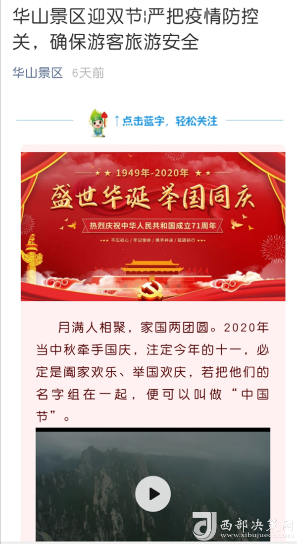 9月30日至10月8日期間,景區(qū)官方微信以歡度雙節(jié)、防疫安全、熱心服務(wù)、旅游攻略等為主題發(fā)布宣傳軟文23篇,累計閱讀量4.2萬人次,分享及轉(zhuǎn)發(fā)量共計1430次;官方微博向游客及時發(fā)布景區(qū)天氣、客流、景色實(shí)況、溫馨提示等景區(qū)度節(jié)綜合信息共計102條,閱讀量高達(dá)101.9萬次,并耐心、細(xì)致解答網(wǎng)友私信、評論共計532條;通過抖音平臺發(fā)布景區(qū)公告、秋日美景、好人好事等短視頻及圖片錦集共計18條,播放量共計 1.4萬次。
