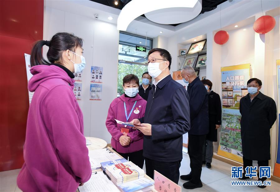 11月3日,中共中央政治局常委、國務院副總理、國務院第七次全國人口普查領導小組組長韓正在北京調研人口普查登記工作。這是韓正在西城區(qū)金融街街道豐融園社區(qū)居委會調研。 新華社記者 張領 攝