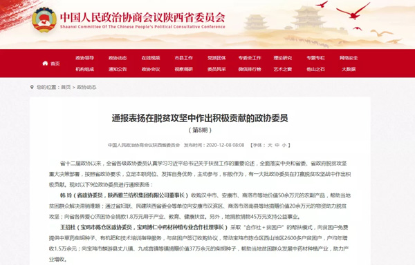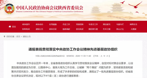 中央政協(xié)工作會(huì)議召開(kāi)一年多來(lái),陜西全省各級(jí)政協(xié)組織認(rèn)真貫徹落實(shí)會(huì)議精神,堅(jiān)持建言資政和凝聚共識(shí)雙向發(fā)力,推動(dòng)政協(xié)工作提質(zhì)增效,形成了許多新的經(jīng)驗(yàn)和成果,涌現(xiàn)出了一批先進(jìn)基層政協(xié)組織。2020年11月2日,省政協(xié)十二屆四十七次主席會(huì)議決定通報(bào)表?yè)P(yáng)貫徹落實(shí)中央政協(xié)工作會(huì)議精神先進(jìn)基層政協(xié)組織,金臺(tái)區(qū)政協(xié)、富平縣政協(xié)、富縣政協(xié)和柞水縣政協(xié)4家縣(區(qū))政協(xié)組織榜上有名。