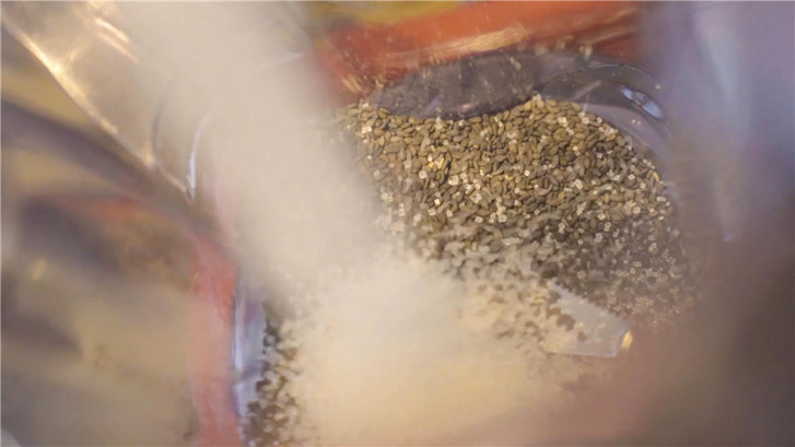 將炒熟的黑芝麻加入白砂糖放入研磨機。