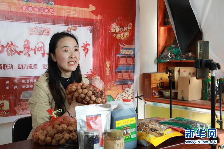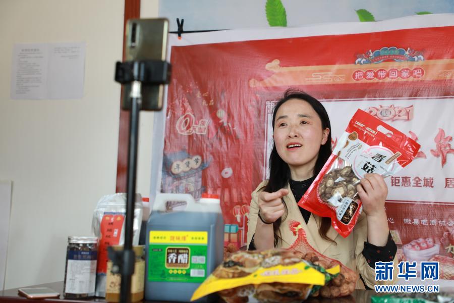 2月23日,在位于甘肅隴南市徽縣的店鋪中,全國人大代表梁倩娟在網(wǎng)上直播銷售當(dāng)?shù)剞r(nóng)特產(chǎn)品。新華社記者 張智敏 攝