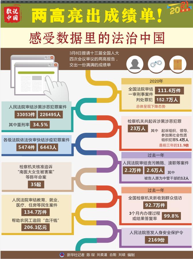 8日提請十三屆全國人大四次會議審議的兩高報告,交出一份滿滿的成績單。掃黑除惡“打傘破網(wǎng)”、嚴(yán)懲腐敗守護(hù)平安、加強民生司法保障……一串串?dāng)?shù)字勾勒出法治中國建設(shè)的亮點。
