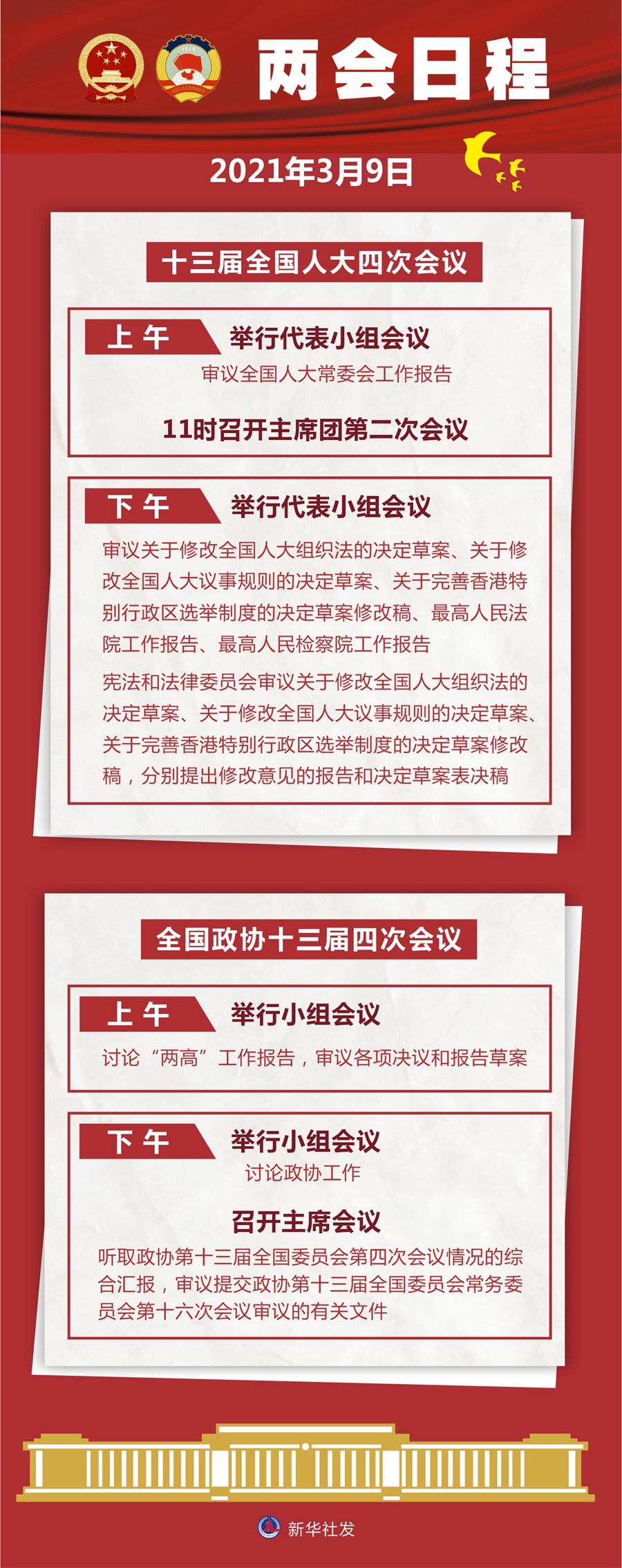十三屆全國人大四次會議9日上午舉行代表小組會議,審議全國人大常委會工作報(bào)告;11時(shí)召開主席團(tuán)第二次會議。下午舉行代表小組會議,審議關(guān)于修改全國人大組織法的決定草案、關(guān)于修改全國人大議事規(guī)則的決定草案、關(guān)于完善香港特別行政區(qū)選舉制度的決定草案修改稿、最高人民法院工作報(bào)告、最高人民檢察院工作報(bào)告;憲法和法律委員會審議關(guān)于修改全國人大組織法的決定草案、關(guān)于修改全國人大議事規(guī)則的決定草案、關(guān)于完善香港特別行政區(qū)選舉制度的決定草案修改稿,分別提出修改意見的報(bào)告和決定草案表決稿。