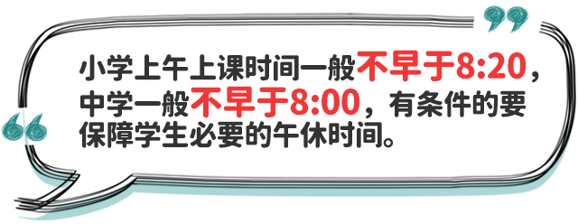 三、統(tǒng)籌安排學(xué)校作息時(shí)間。省級教育行政部門要從保證學(xué)生充足睡眠需要出發(fā),結(jié)合實(shí)際情況合理確定中小學(xué)作息時(shí)間。小學(xué)上午上課時(shí)間一般不早于8:20,中學(xué)一般不早于8:00;學(xué)校不得要求學(xué)生提前到校參加統(tǒng)一的教育教學(xué)活動,對于個(gè)別因家庭特殊情況提前到校學(xué)生,學(xué)校應(yīng)提前開門、妥善安置;合理安排課間休息和下午上課時(shí)間,有條件的地方和學(xué)校應(yīng)保障學(xué)生必要的午休時(shí)間;寄宿制學(xué)校要合理安排作息時(shí)間,確保學(xué)生達(dá)到規(guī)定睡眠時(shí)間要求。