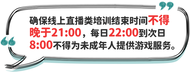 五、合理安排學(xué)生就寢時(shí)間。中小學(xué)校要指導(dǎo)家長和學(xué)生,制訂學(xué)生作息時(shí)間表,在保證學(xué)生睡眠時(shí)間要求前提下,結(jié)合學(xué)生個(gè)體睡眠狀況、午休時(shí)間等實(shí)際,合理確定學(xué)生晚上就寢時(shí)間,促進(jìn)學(xué)生自主管理、規(guī)律作息、按時(shí)就寢。小學(xué)生就寢時(shí)間一般不晚于21:20;初中生一般不晚于22:00;高中生一般不晚于23:00。個(gè)別學(xué)生經(jīng)努力到就寢時(shí)間仍未完成作業(yè)的,家長應(yīng)督促按時(shí)就寢不熬夜,確保充足睡眠;教師應(yīng)有針對性幫助學(xué)生分析原因,加強(qiáng)學(xué)業(yè)輔導(dǎo),提出改進(jìn)策略,如有必要可調(diào)整作業(yè)內(nèi)容和作業(yè)量。各地教育部門要會同相關(guān)部門切實(shí)加強(qiáng)對轄區(qū)內(nèi)注冊登記或備案的線上培訓(xùn)網(wǎng)課平臺、網(wǎng)絡(luò)游戲的規(guī)范管理,采取技術(shù)手段進(jìn)行監(jiān)管,確保線上直播類培訓(xùn)活動結(jié)束時(shí)間不得晚于21:00,每日22:00到次日8:00不得為未成年人提供游戲服務(wù)。