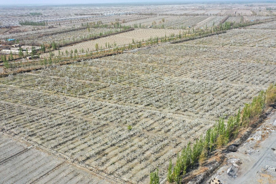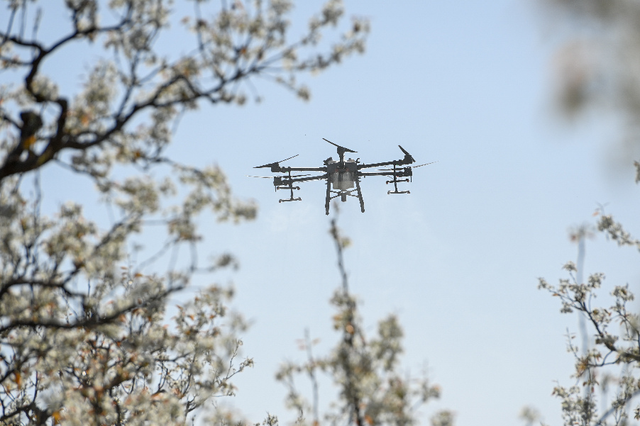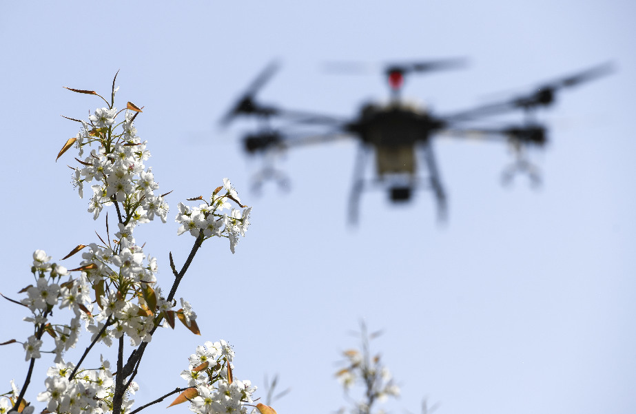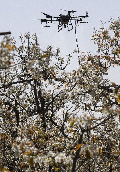 在新疆南疆等地,梨樹花期很短,且往往伴隨沙塵天氣,梨樹授粉作為梨產(chǎn)業(yè)發(fā)展中最為關(guān)鍵的一環(huán),以往通過人工授粉或者蜜蜂授粉進行。隨著人工成本不斷增加以及產(chǎn)業(yè)健康發(fā)展需要,以蜜蜂采集的高活性授粉用花粉聯(lián)合無人機噴施的蜂機協(xié)同作業(yè)高效液體授粉技術(shù)開始出現(xiàn)。