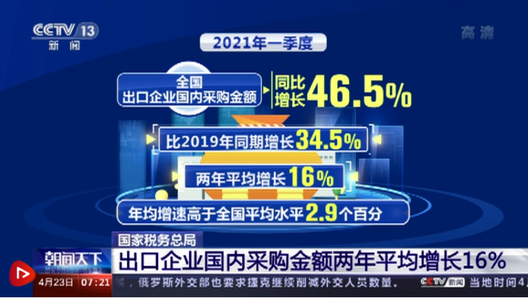 2021年一季度,海外需求復(fù)蘇繼續(xù)拉動我國出口快速增長,全國出口企業(yè)國內(nèi)采購金額同比增長46.5%,比2019年同期增長34.5%,兩年平均增長16%,年均增速高于全國平均水平2.9個百分點。