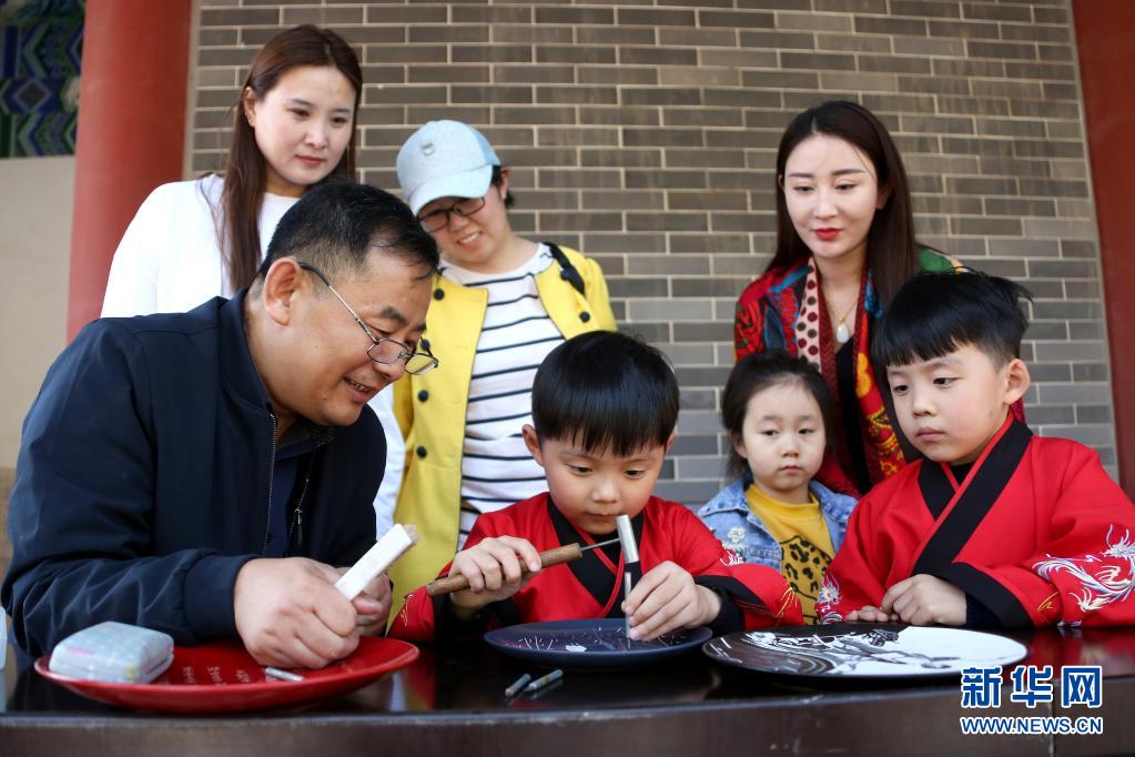 5月1日,在山東省棗莊市孟莊鎮(zhèn)境內的龜山風景區(qū),民間藝人胡安同(前左一)向小朋友傳授非遺刻瓷技藝。文化和旅游部5月5日晚間公布2021年“五一”假期旅游市場數據。統(tǒng)計顯示,5月1日至5日,全國國內旅游出游2.3億人次,同比增長119.7%,按可比口徑恢復至疫前同期的103.2%。新華社發(fā)(孫中喆 攝)