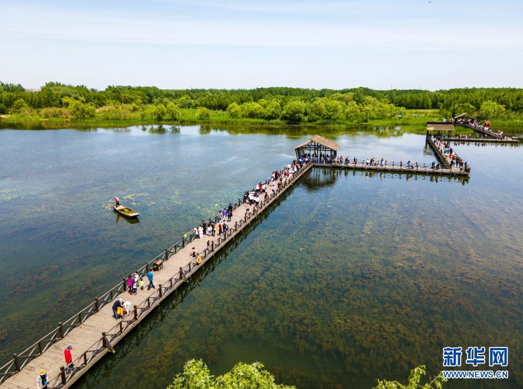 5月2日,游客在江蘇省泰州市姜堰區(qū)溱湖國家濕地公園棧道上游覽(無人機照片)。文化和旅游部5月5日晚間公布2021年“五一”假期旅游市場數據。統(tǒng)計顯示,5月1日至5日,全國國內旅游出游2.3億人次,同比增長119.7%,按可比口徑恢復至疫前同期的103.2%。新華社發(fā)(顧繼紅 攝)