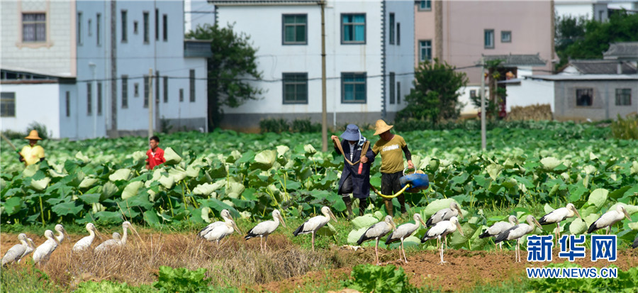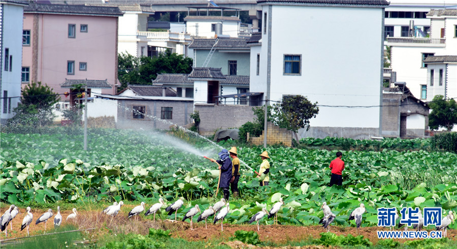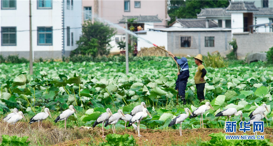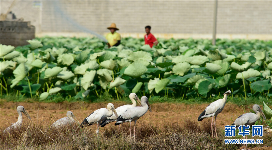 近日,云南省彌勒市竹園鎮(zhèn)農(nóng)民在荷田間勞作,不遠(yuǎn)處許多鉗嘴鸛在田邊地頭棲息覓食,一幅人鳥和諧的生態(tài)畫卷徐徐展開。2006年,中國(guó)在云南大理首次記錄到鉗嘴鸛。近年來(lái),隨著生態(tài)環(huán)境不斷改善,云南多地均發(fā)現(xiàn)鉗嘴鸛。新華網(wǎng)發(fā)(普佳勇攝影報(bào)道)