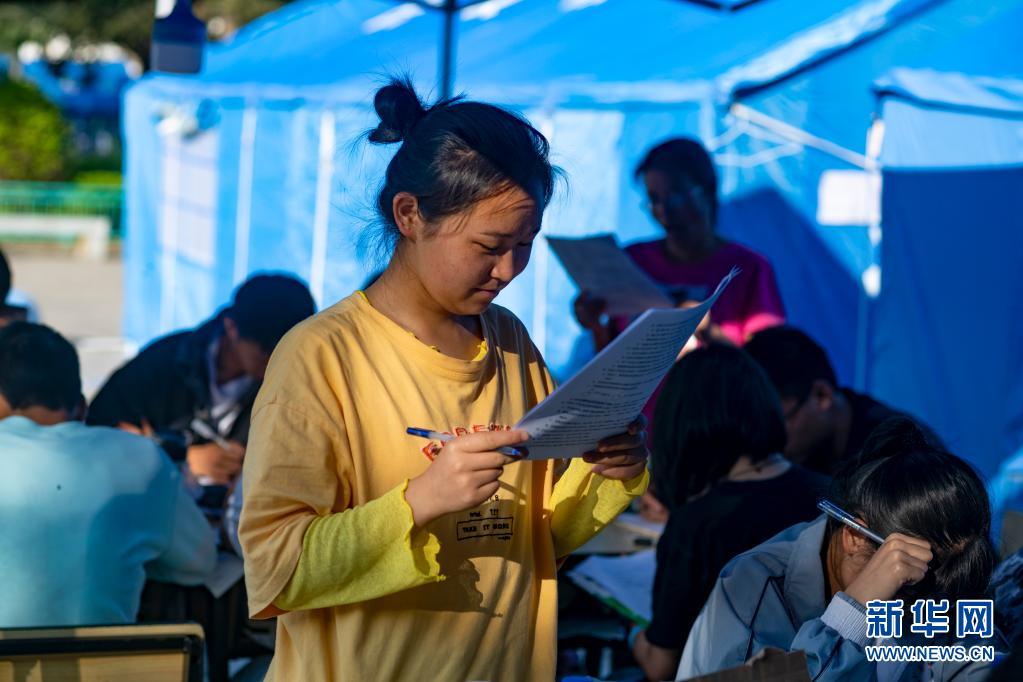 課堂就設(shè)在操場上帳篷里。第一個晨讀課是化學(xué)課;30分鐘后,第二個晨讀課是語文課;7點(diǎn)55分,開始上第一節(jié)課生物課……忙碌中,陳亦婷心里雖然微微還有地震的影子,但感覺與備戰(zhàn)高考相比,這已不算什么。“自己的人生就是要去奮斗。”想到這里,她揮筆在生物的卷子上寫上答案。