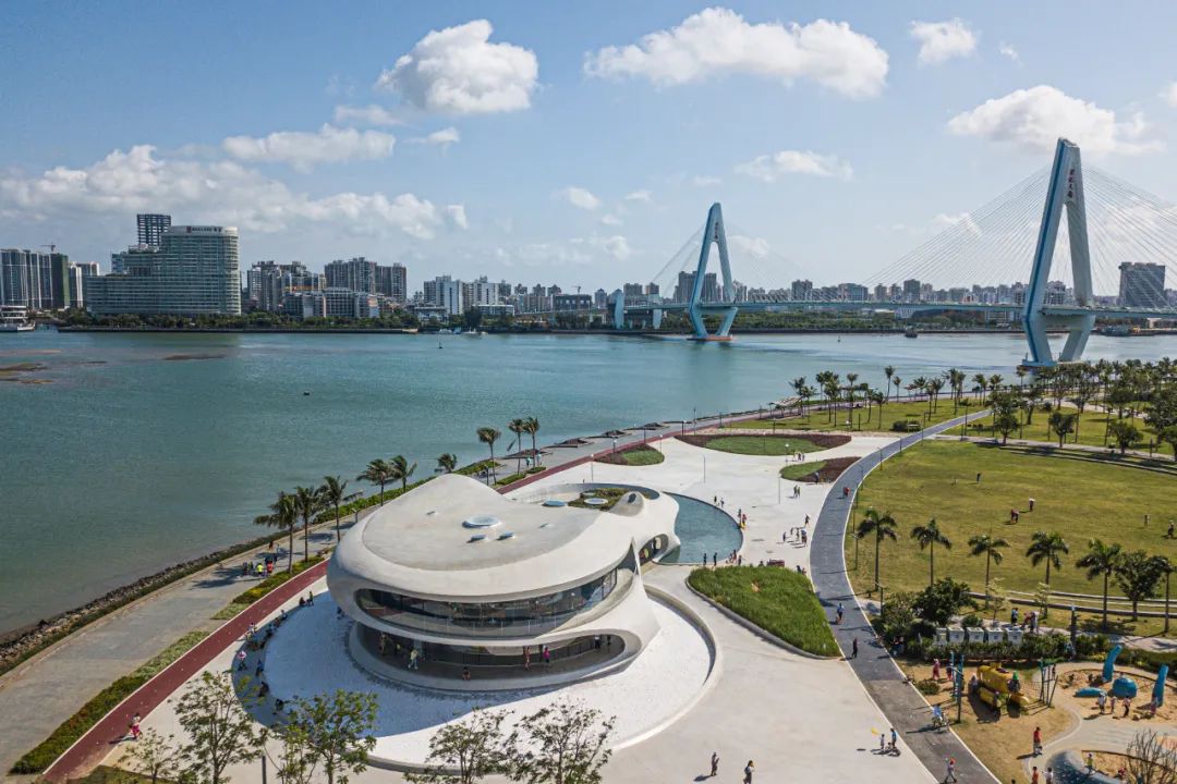 ▲“十四五”開局之年,也是海南全面深化改革開放和加快建設自由貿易港關鍵之年。這是5月3日在??谂臄z的云洞圖書館,遠處是??诘貥耸兰o大橋(無人機照片)。新華社記者 蒲曉旭 攝