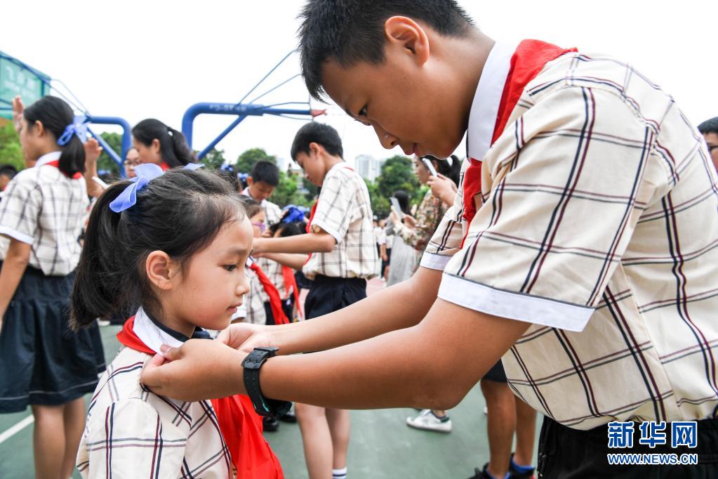 5月31日,高年級(jí)的少先隊(duì)員在入隊(duì)儀式上為新入隊(duì)的同學(xué)系紅領(lǐng)巾。新華社記者 劉續(xù) 攝