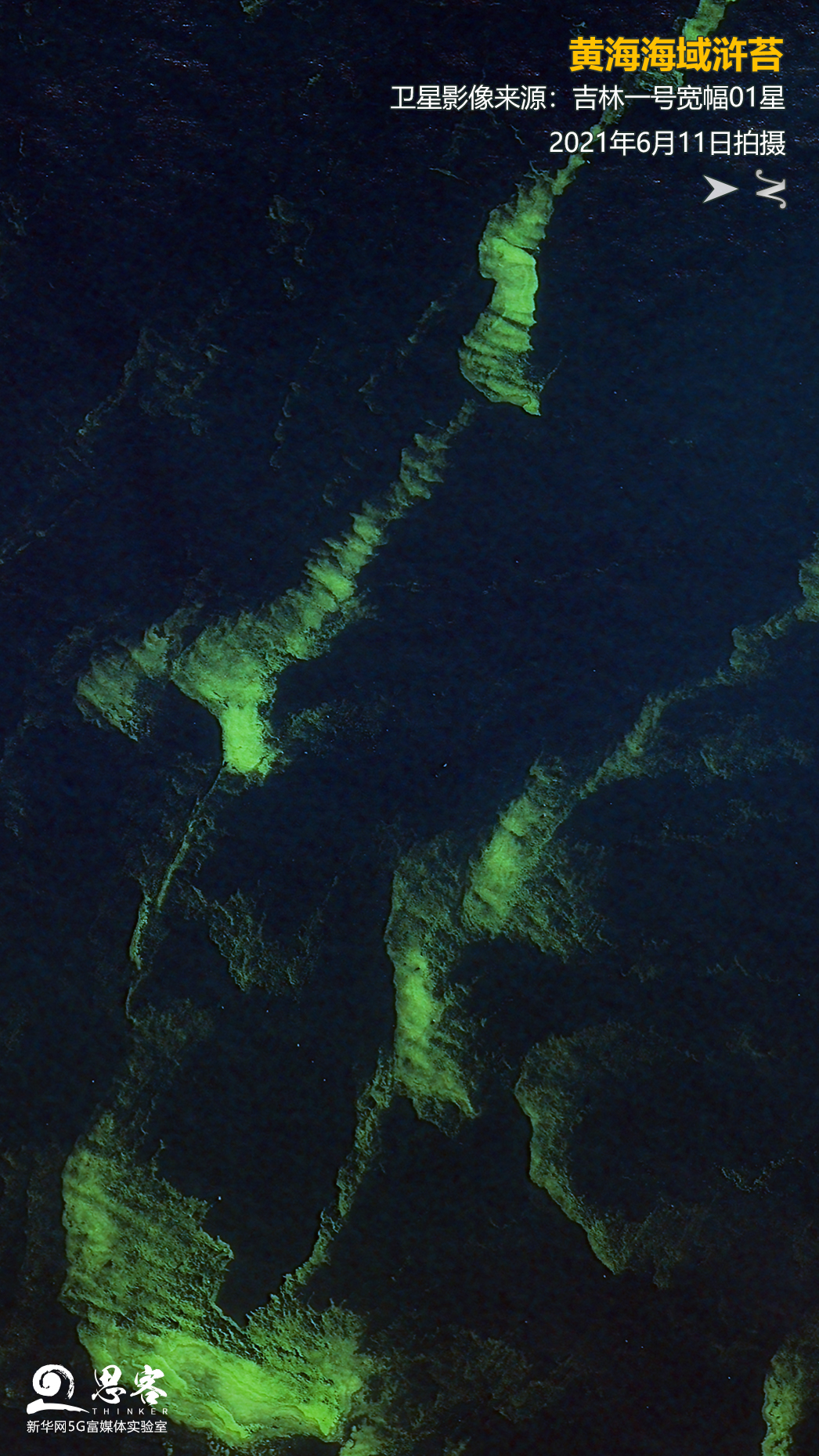 ▲圖為吉林一號(hào)寬幅01星2021年6月11日拍攝的黃海海域滸苔。