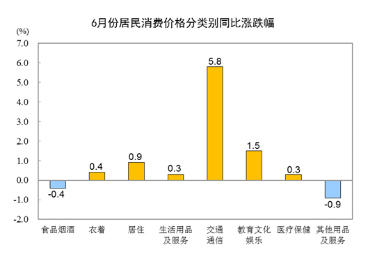 6月份,食品煙酒類價(jià)格同比下降0.4%,影響CPI(居民消費(fèi)價(jià)格指數(shù))下降約0.12個(gè)百分點(diǎn)。食品中,畜肉類價(jià)格下降19.5%,影響CPI下降約0.81個(gè)百分點(diǎn),其中豬肉價(jià)格下降36.5%,影響CPI下降約0.80個(gè)百分點(diǎn);蛋類價(jià)格上漲17.9%,影響CPI上漲約0.10個(gè)百分點(diǎn);水產(chǎn)品價(jià)格上漲14.2%,影響CPI上漲約0.26個(gè)百分點(diǎn);鮮果價(jià)格上漲3.1%,影響CPI上漲約0.06個(gè)百分點(diǎn);糧食價(jià)格上漲0.7%,影響CPI上漲約0.01個(gè)百分點(diǎn)。