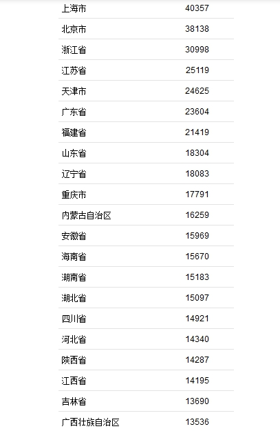 根據(jù)上半年全國(guó)居民人均可支配收入水平相比,上海、北京、浙江、江蘇、天津、廣東、福建、山東、遼寧、重慶這10個(gè)省份的人均可支配收入跑贏了全國(guó)水平。