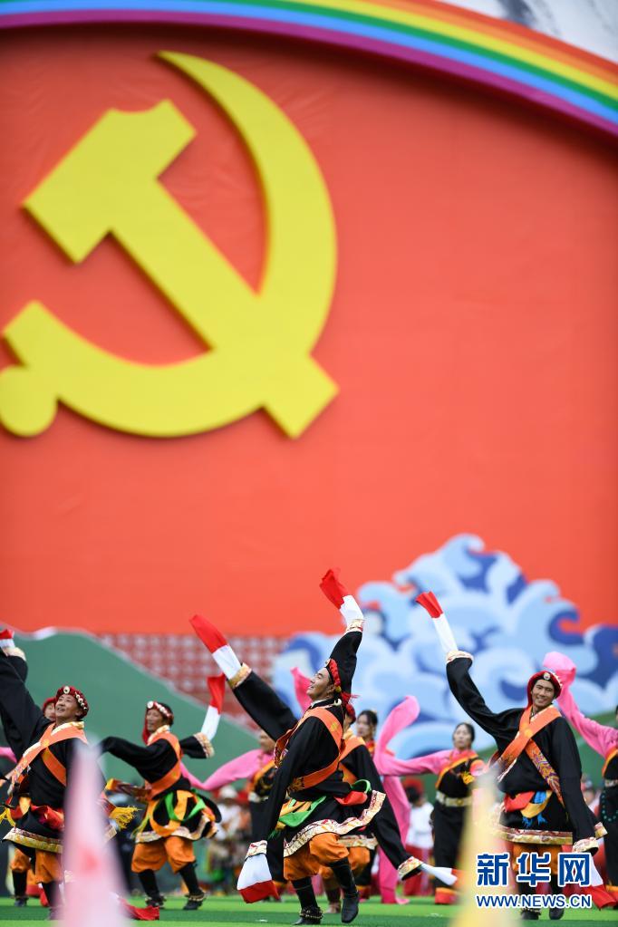 8月4日,當(dāng)?shù)厝罕娫谟駱洳刈遄灾沃莩闪?0周年慶祝大會(huì)上表演節(jié)目。新華社記者 吳剛 攝