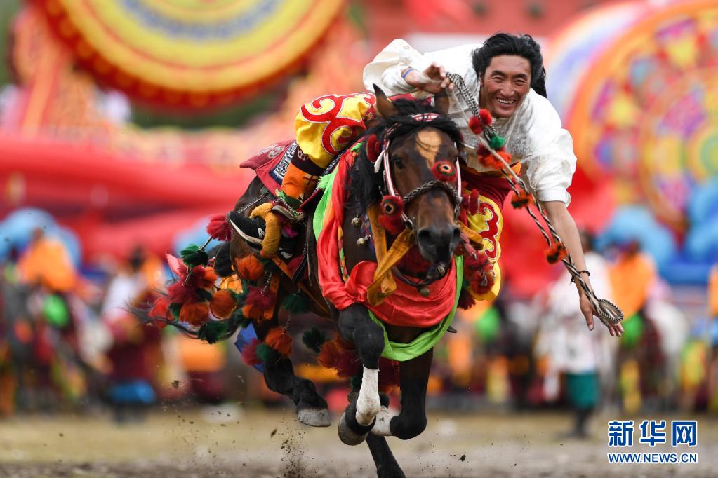 8月4日,當(dāng)?shù)厝罕娫谟駱洳刈遄灾沃莩闪?0周年慶祝大會(huì)上表演傳統(tǒng)賽馬。新華社記者 吳剛 攝