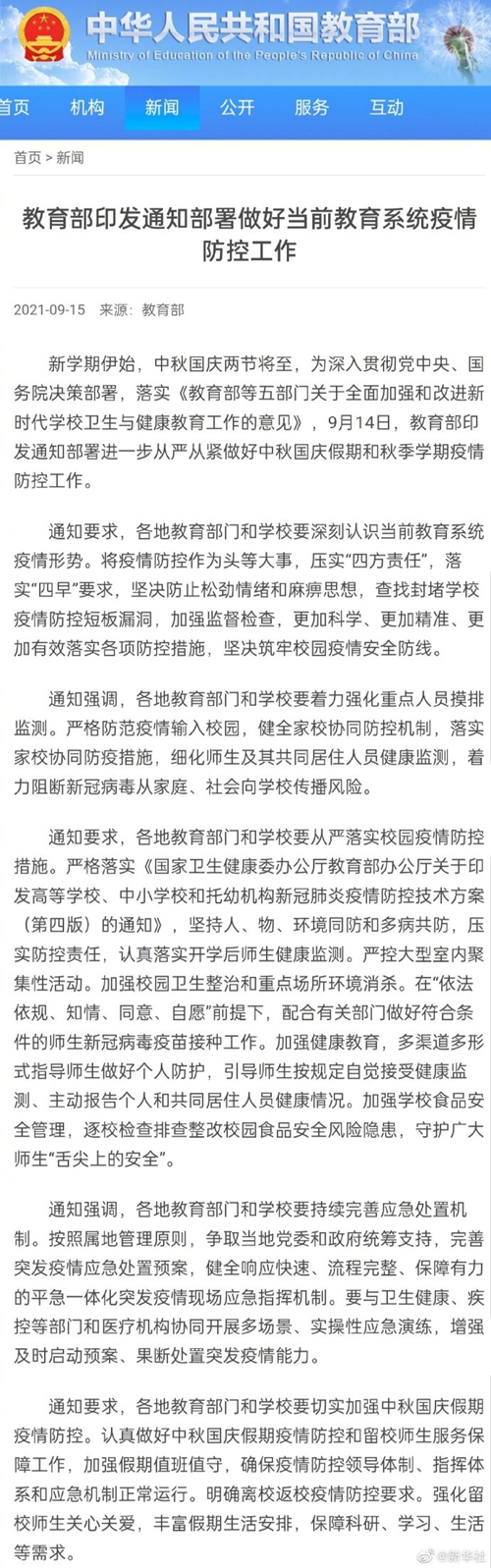 記者15日從教育部獲悉,教育部日前印發(fā)通知部署進一步從嚴從緊做好中秋國慶假期和秋季學期疫情防控工作。通知要求,各地教育部門和學校要將疫情防控作為頭等大事,查找封堵學校疫情防控短板漏洞,健全家校協(xié)同防控機制,細化師生及其共同居住人員健康監(jiān)測,著力阻斷新冠病毒從家庭、社會向學校傳播風險。通知要求,各地教育部門和學校要做好中秋國慶假期疫情防控和留校師生服務保障工作,加強假期值班值守,確保疫情防控領導體制、指揮體系和應急機制正常運行。(記者余俊杰)