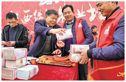 2019年1月18日,安義縣“糧王”凌繼河(右三)給農民員工發(fā)放獎金。(新華社資料片)