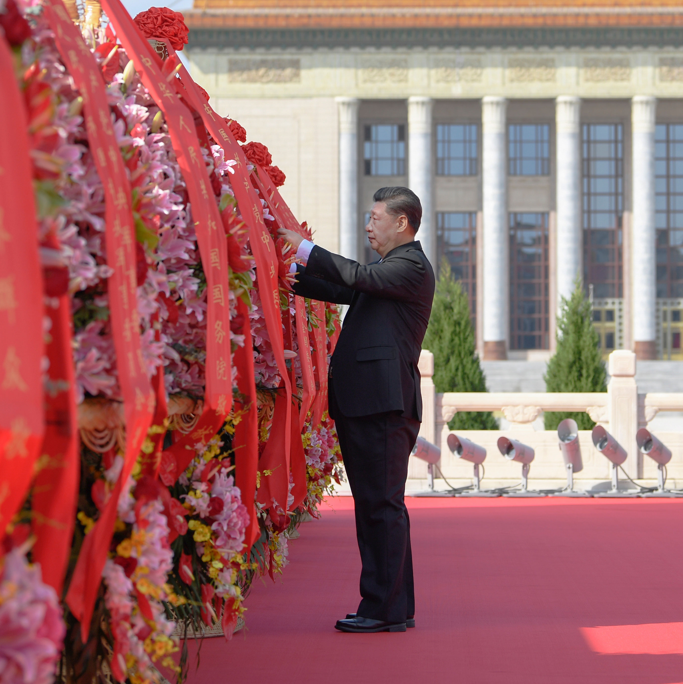 △2020年9月30日上午,習近平總書記出席烈士紀念日向人民英雄敬獻花籃儀式。這是習近平總書記整理花籃上的緞帶。