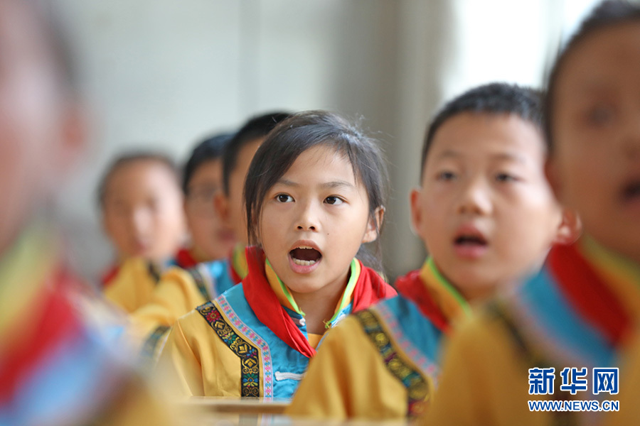 課堂上,彭水自治縣鞍子鎮(zhèn)小學4年級1班孩子們正跟著任茂淑一起傳唱苗族民歌。新華網(wǎng)發(fā)(趙勇 攝)