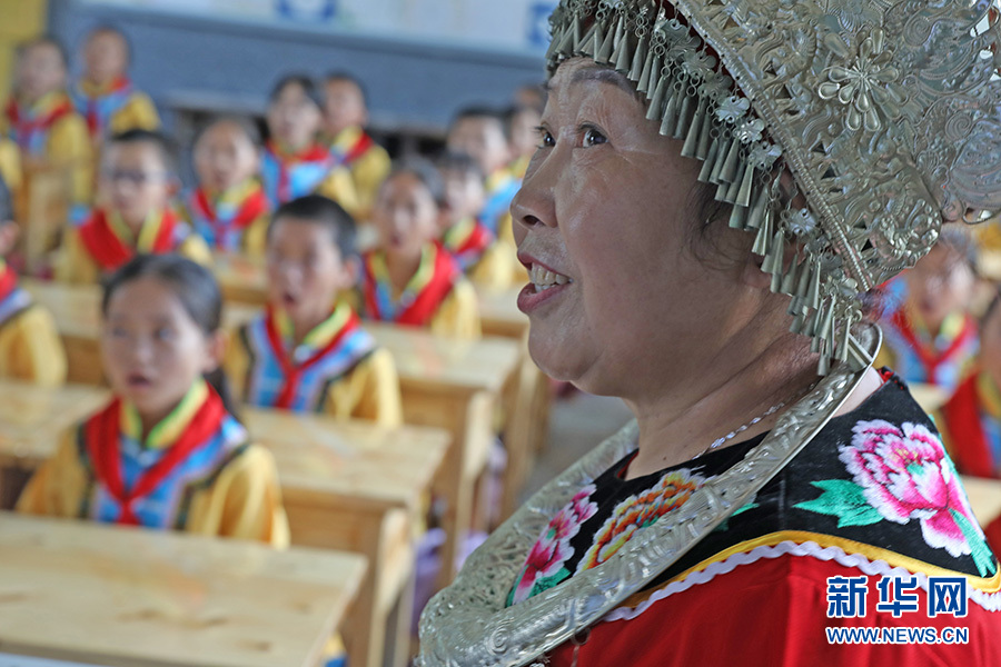 9月28日,“苗族民歌”非物質文化遺產(chǎn)傳承人任茂淑正在課堂上教孩子們傳唱苗族民歌代表作《嬌阿依》。新華網(wǎng)發(fā)(趙勇 攝)