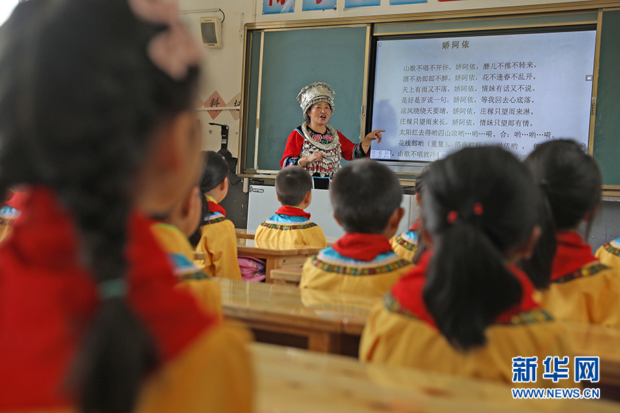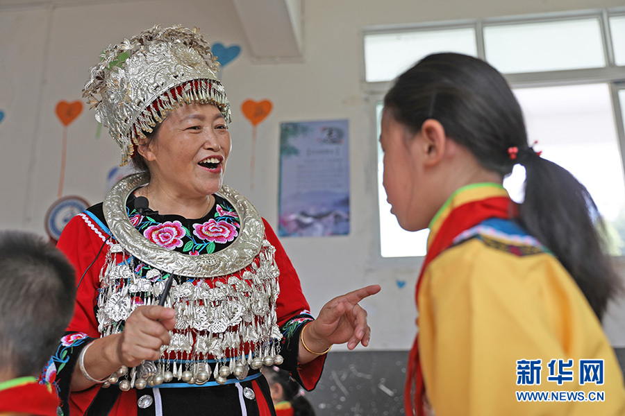 在教室內,任茂淑不僅面對面地教唱,還細心地為孩子們講解民歌的內涵。她說,自己作為一名非遺傳承人,每學期都要到學校為孩子們教唱苗族民歌,通過傳承人走進課堂的方式,讓更多學生了解苗歌、傳唱苗族民歌,更好地保護和傳承這一非物質文遺產(chǎn)。新華網(wǎng)發(fā)(趙勇 攝)