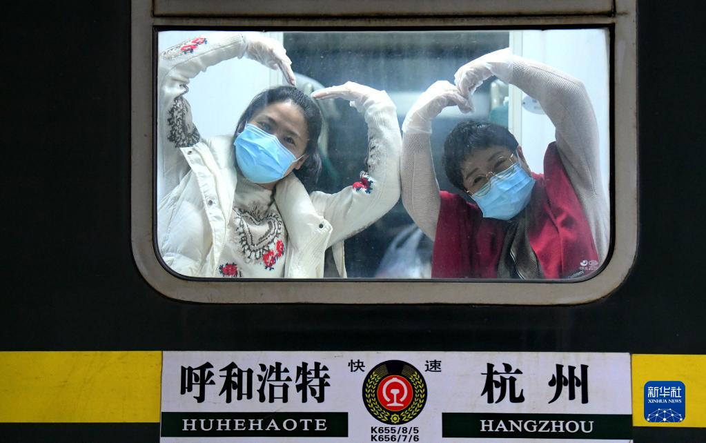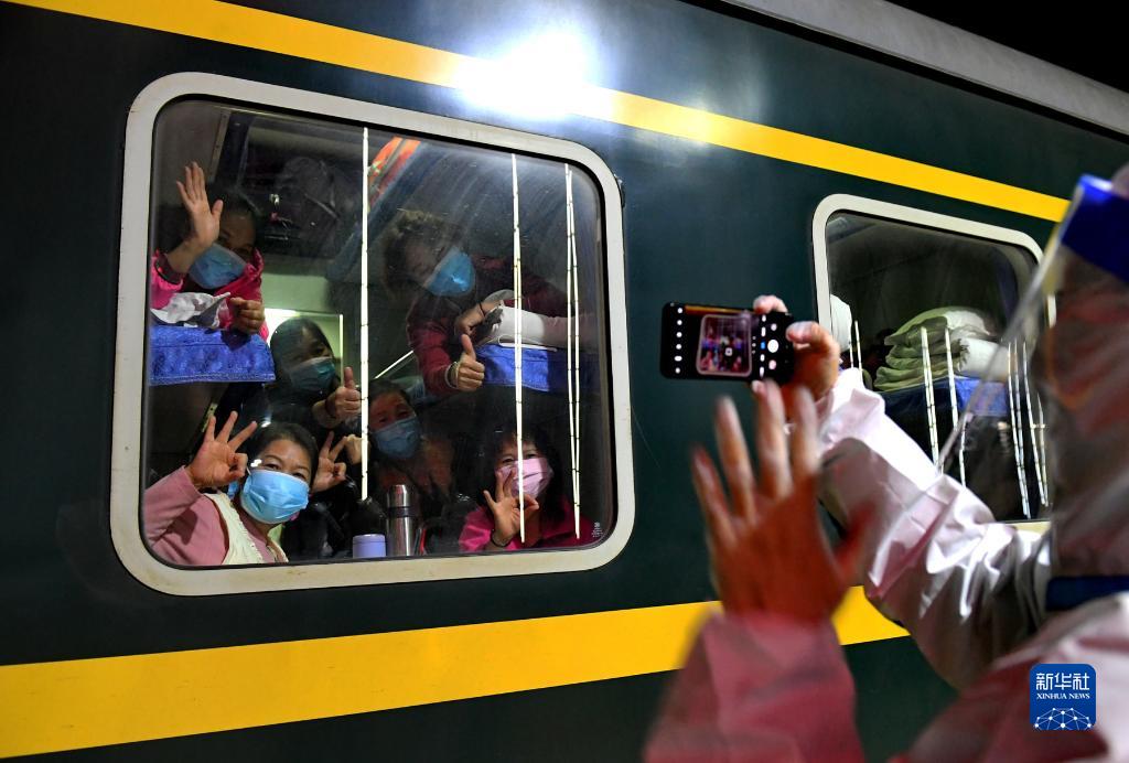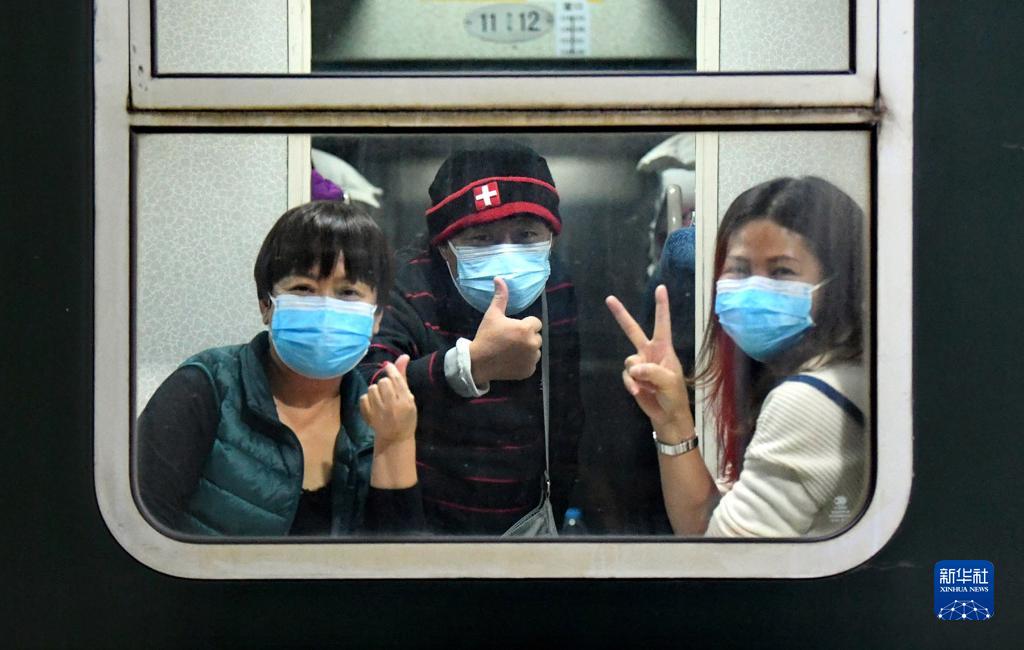 10月29日,滯留游客離開額濟(jì)納旗時(shí),在列車車廂里與地面人員告別。新華社發(fā)(王磊 攝)