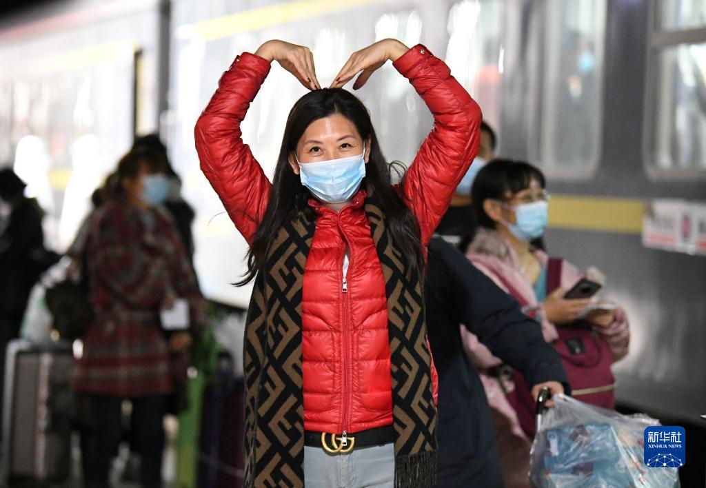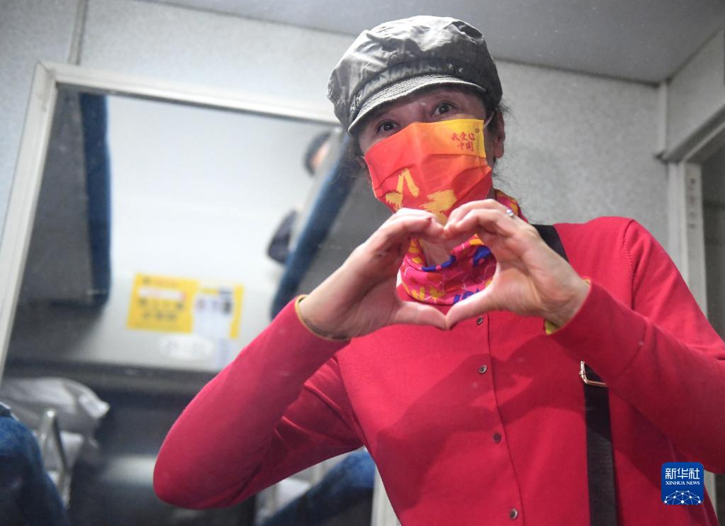 10月29日,一名滯留游客離開額濟(jì)納旗時(shí),在列車車廂里用雙手比劃出“愛心”。新華社發(fā)(王磊 攝)
