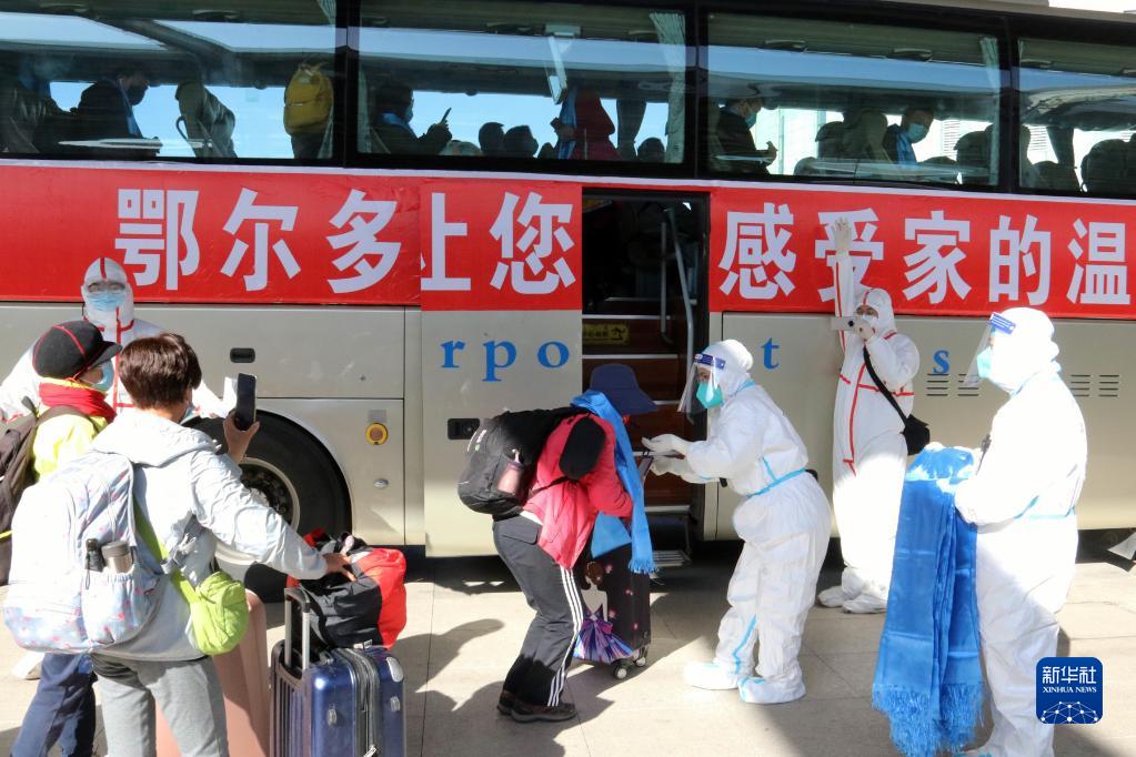 站臺(tái)外,一輛輛掛有“人民至上,生命至上”“鄂爾多斯讓您感受家的溫暖”等橫幅標(biāo)語的大客車旁,寫有“伊金霍洛歡迎您”“康巴什歡迎您”“東勝歡迎您”的標(biāo)識(shí)牌,十分醒目。