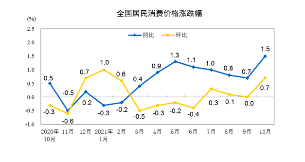 國家統(tǒng)計(jì)局10日發(fā)布數(shù)據(jù),10月份,全國居民消費(fèi)價(jià)格指數(shù)(CPI)同比上漲1.5%,漲幅雖比上月擴(kuò)大0.8個(gè)百分點(diǎn),但仍低于宏觀調(diào)控預(yù)期目標(biāo),消費(fèi)市場供需基本平穩(wěn)。
