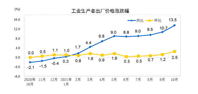 專家分析,部分食品和工業(yè)消費(fèi)品價(jià)格漲幅擴(kuò)大,顯示大宗商品價(jià)格上漲壓力正向部分終端消費(fèi)品傳導(dǎo)。據(jù)統(tǒng)計(jì),受國際輸入性因素疊加國內(nèi)主要能源和原材料供應(yīng)偏緊影響,10月份,全國工業(yè)生產(chǎn)者出廠價(jià)格指數(shù)(PPI)同比上漲13.5%,漲幅比上月擴(kuò)大2.8個(gè)百分點(diǎn)。