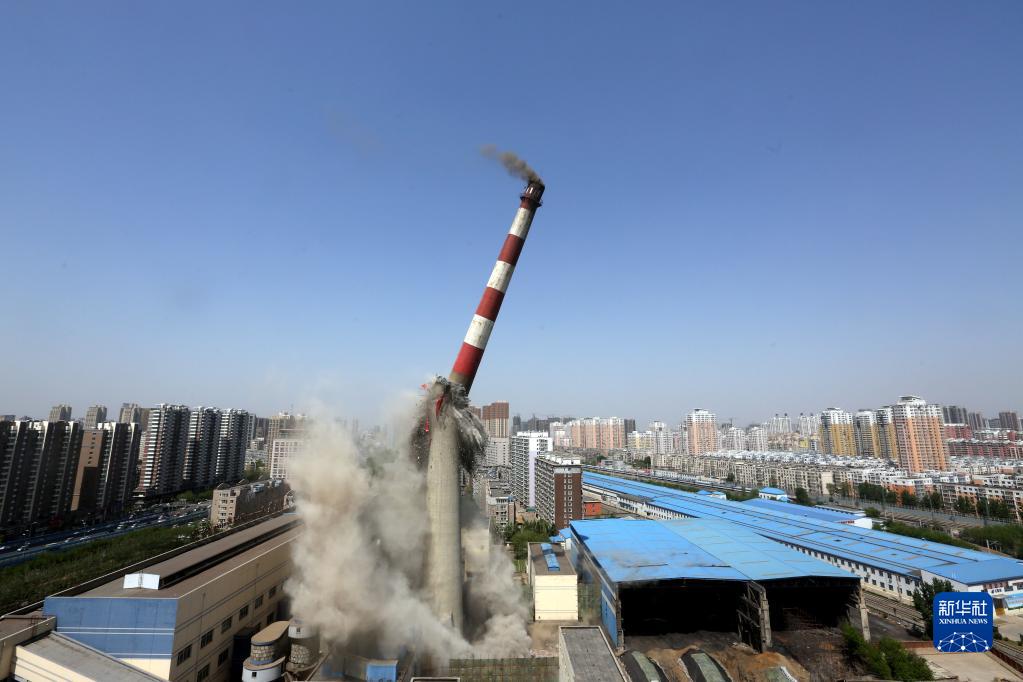 位于沈陽市北一路的一座150米高大煙囪爆破成功(2014年4月28日攝)。 新華社記者 姚劍鋒 攝