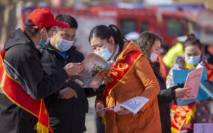 2021年12月4日上午,洛浦縣科技局工作人員在該縣艾德萊斯廣場,正在向當地居民進行講解“科普知識”。買買提艾力·艾尼瓦爾攝
