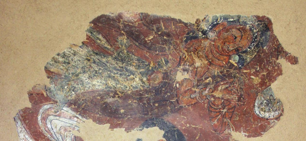 武威市天梯山石窟保護(hù)研究所文物研究室主任蔡建宏介紹,此壁畫位于第4窟中心柱背面第一級塔柱上沿處,整幅壁畫面積約為0.6平方米。壁畫中自下而上共出現(xiàn)了三身人物形象:最下面一身殘缺,僅存雙眼至頭頂部分;中間一身為胡跪式供養(yǎng)菩薩形象;上層為完整的橫式飛天形象。