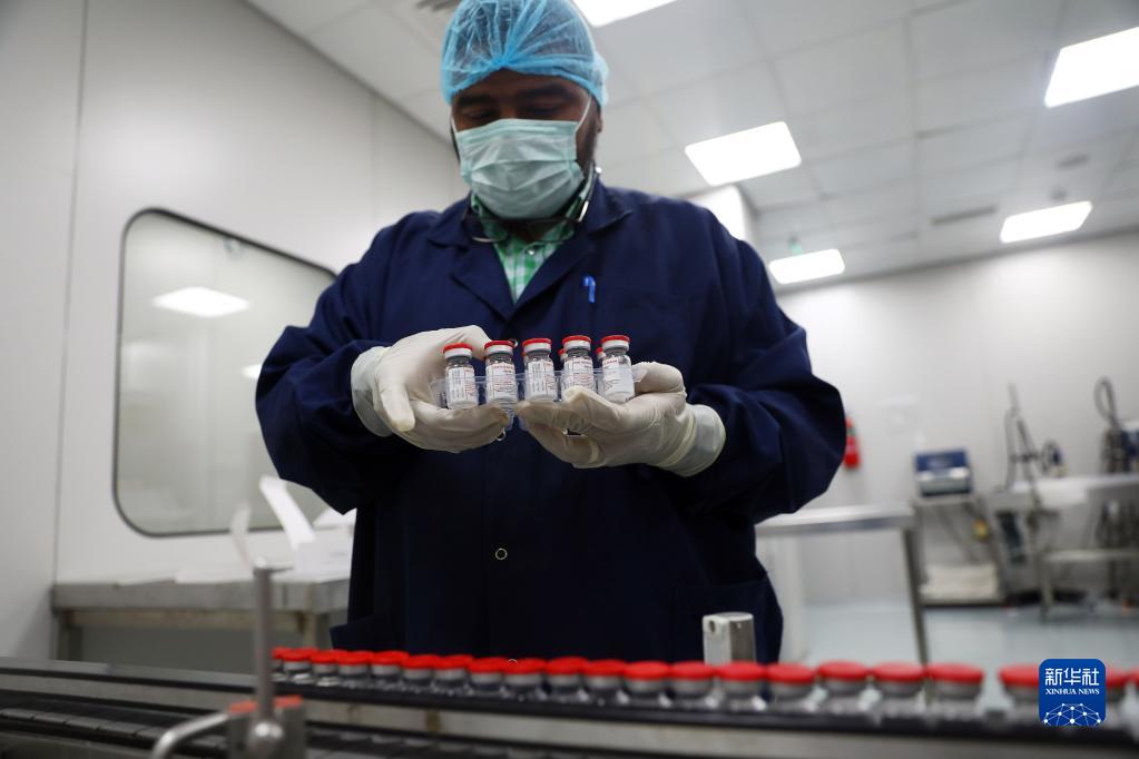 在埃及吉薩的埃及生物制品與疫苗公司疫苗生產(chǎn)廠,工作人員對(duì)貼標(biāo)的新冠疫苗進(jìn)行裝盒前準(zhǔn)備(2021年9月6日)。新華社發(fā)(艾哈邁德·戈馬攝)