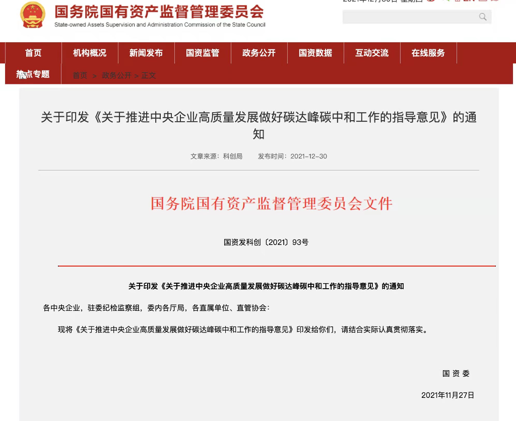 國(guó)務(wù)院國(guó)資委30日對(duì)外發(fā)布《關(guān)于推進(jìn)中央企業(yè)高質(zhì)量發(fā)展做好碳達(dá)峰碳中和工作的指導(dǎo)意見》,明確了中央企業(yè)做好碳達(dá)峰碳中和工作的總體要求與主要目標(biāo)。