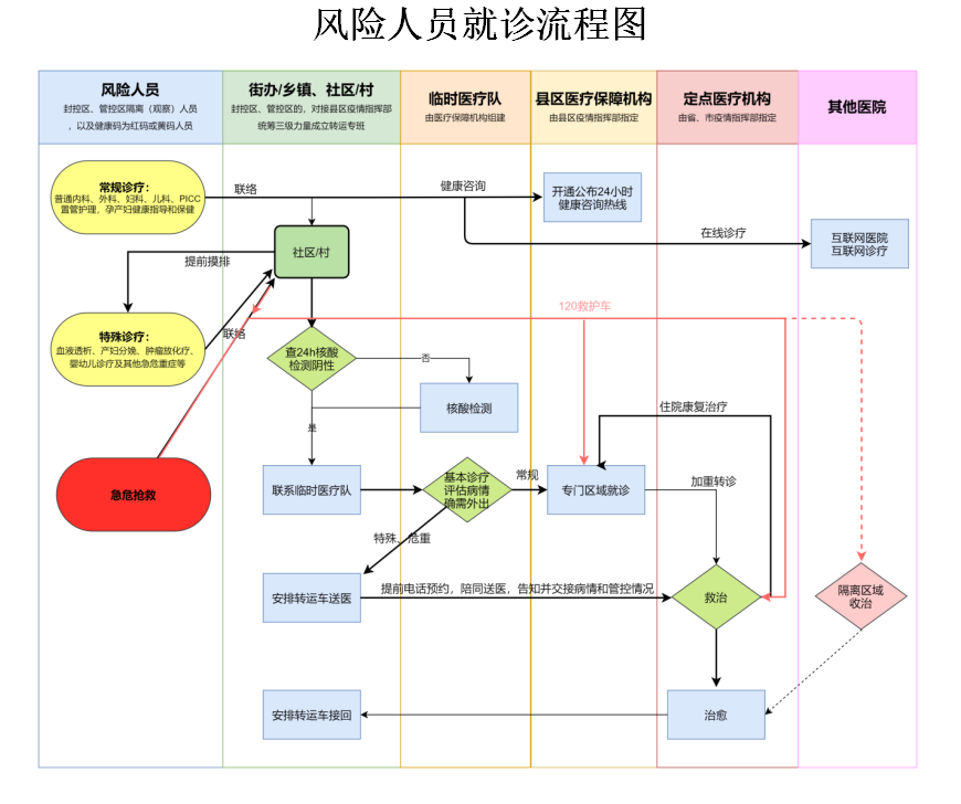 有急診搶救醫(yī)療需求的風(fēng)險人員,直接撥打120急救電話,同時通知社區(qū)(村)工作人員對接120救護(hù)車、填寫人員交接單,由120救護(hù)車聯(lián)系風(fēng)險人員醫(yī)療保障醫(yī)療機(jī)構(gòu)、定點醫(yī)療機(jī)構(gòu),或就近送至具備相應(yīng)診療能力的醫(yī)療機(jī)構(gòu)。診療結(jié)束后,醫(yī)療機(jī)構(gòu)聯(lián)系社區(qū)(村)由縣區(qū)轉(zhuǎn)運(yùn)專班“點對點”接回。
