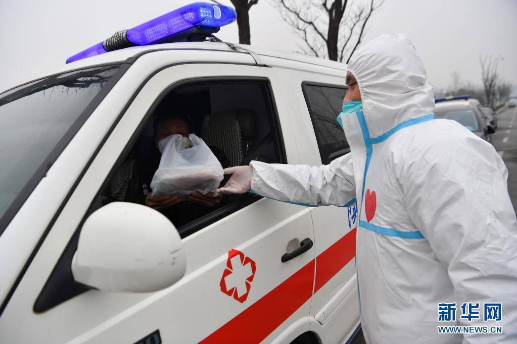 1月4日,在西安市雁塔區(qū),志愿者暢璘將食品送至一位負(fù)責(zé)運輸核酸檢測樣本的救護車駕駛員手中。新華社記者 張博文 攝