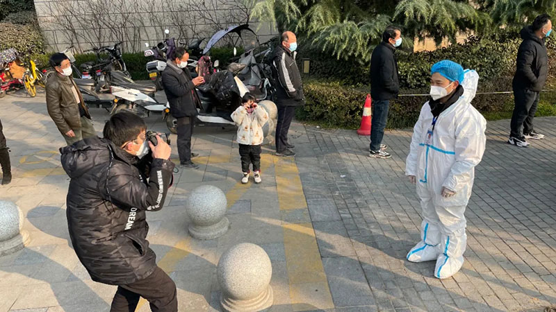 2022年1月2日,三秦都市報記者張宸豪(左)在西安市太華南路街道采訪防疫工作者。