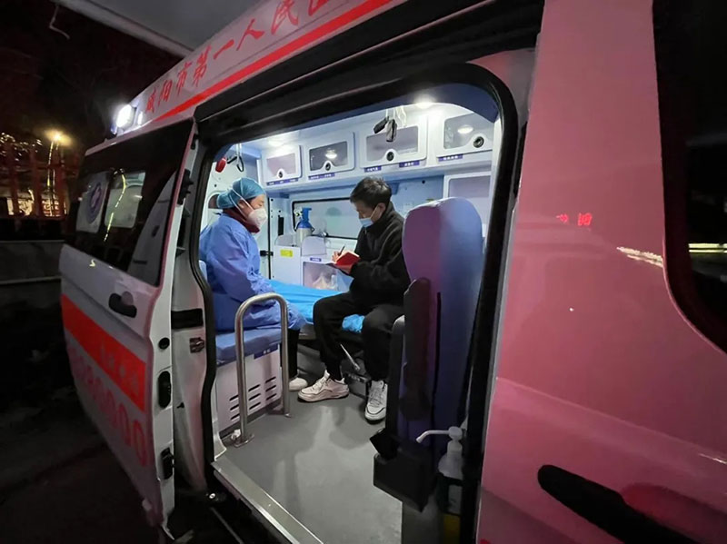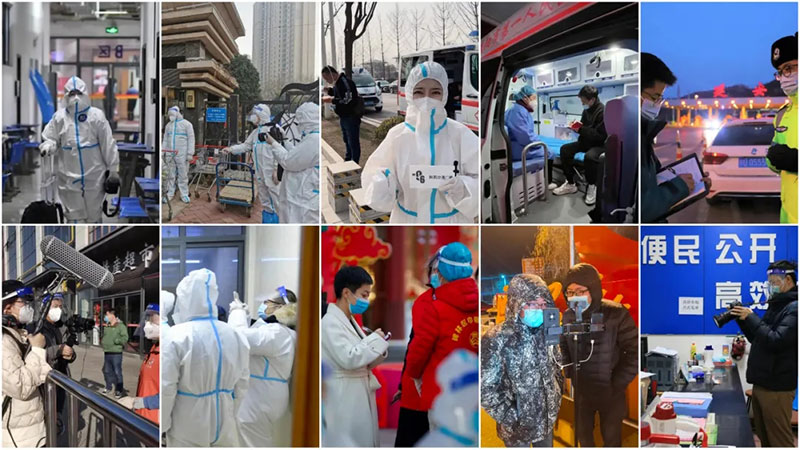 2022年1月4日,人民日報社記者原韜雄(左一)在新冠確診病例收治點西安市胸科醫(yī)院采訪。