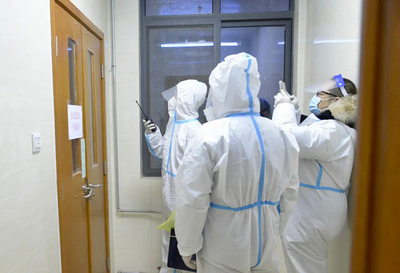 2021年12月25日,華商報記者寧峰(右)在西安市胸科醫(yī)院污染區(qū)采訪。