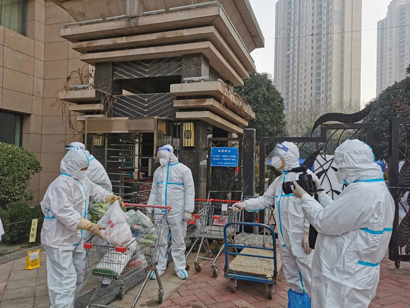 2021年12月24日,中央廣播電視總臺陜西總站記者吳成軒(右二)、攝像郭升(右一)采訪為老弱群體上門配送生活物資的社區(qū)工作人員。