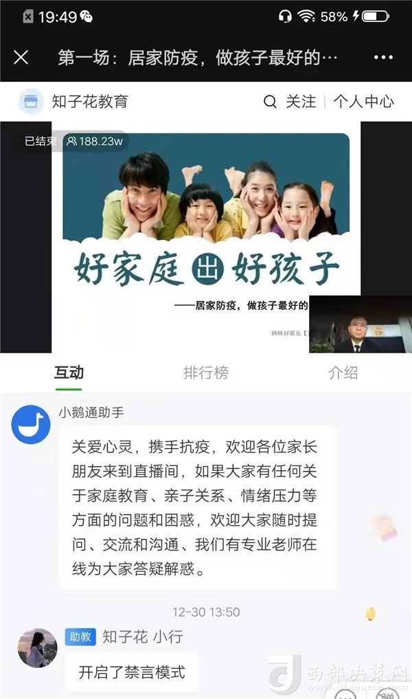 該校全體學(xué)生和學(xué)生家長按時觀看了每一場直播講座。專家提醒家長一定要在生活上多關(guān)心孩子,用心陪伴孩子,在生活中做孩子的榜樣。通過參與本次活動,大家都感覺受益匪淺,同時還拉近了親子關(guān)系,掌握了情緒調(diào)節(jié)的小技巧,引導(dǎo)家長和孩子們能更加積極樂觀的適應(yīng)疫情下的生活,享受美好的親子時光。