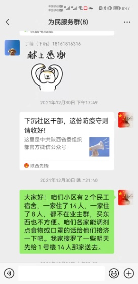 看著手里拎的幾顆白菜、蘿卜、西紅柿,我感到慚愧難當(dāng),作為一名黨員、一名下沉干部,實(shí)在是失職,沒(méi)有履行好“民之所憂,我必念之;民之所盼,我必行之”的使命擔(dān)當(dāng)。投送完愛(ài)心菜到家后,我立即在群里倡議小區(qū)下沉干部對(duì)1-3-2302的務(wù)工人員開展愛(ài)心救助活動(dòng),并從自家的抗疫儲(chǔ)備物資里勻出了2袋子蔬菜、豆腐乳、魚醬罐頭、口罩、水果等物資,并附上了溫馨小紙條,寫上我的聯(lián)系電話,鼓勵(lì)他們堅(jiān)定克服困難的信心和決心。第二天,社區(qū)領(lǐng)導(dǎo)、小區(qū)鄰居們得知情況后,紛紛伸出援助之手,不到半小時(shí),鍋灶有了、菜刀案板有了、糧食蔬菜也都有了…,社區(qū)的慰問(wèn)品也送來(lái)了。大伙不僅給他們送去了物資,更送去了關(guān)心和安慰,他們的生活起居也迅速融入了小區(qū)大家庭,業(yè)主群里每天都有人對(duì)他們噓寒問(wèn)暖,他們也經(jīng)常在業(yè)主群曬他們做的川味美食。他們私下跟我說(shuō),這幾年,他們?cè)诤?、新疆等地都遇到過(guò)疫情,但最讓他們感動(dòng)的還是西安,黨和政府的細(xì)致安排、西安人民的熱情相助,讓他們?cè)谒l(xiāng)異地孤立無(wú)援時(shí),第一次感到不慌了。