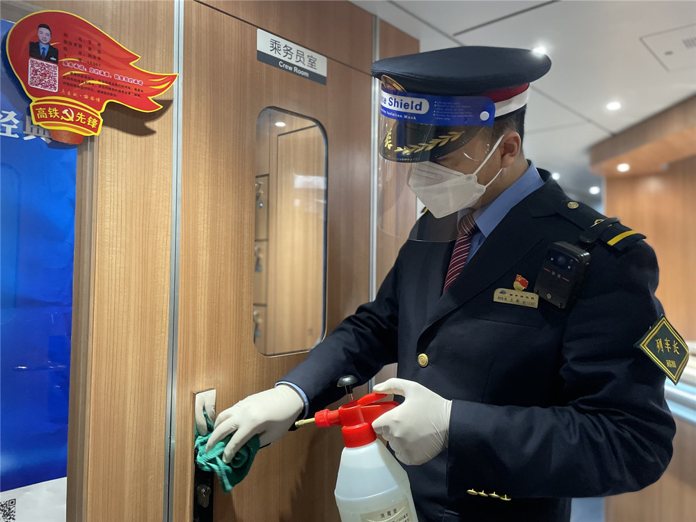 西安“高鐵先鋒”給車內公共區(qū)域消毒。