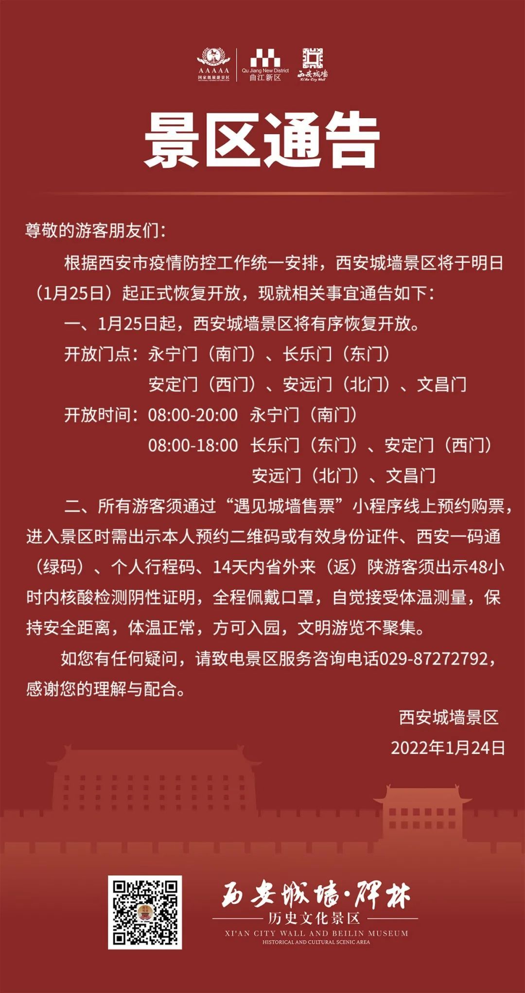 根據(jù)西安市疫情防控工作統(tǒng)一安排,西安城墻景區(qū)將于明日(1月25日)起正式恢復開放,現(xiàn)就相關(guān)事宜通告如下: